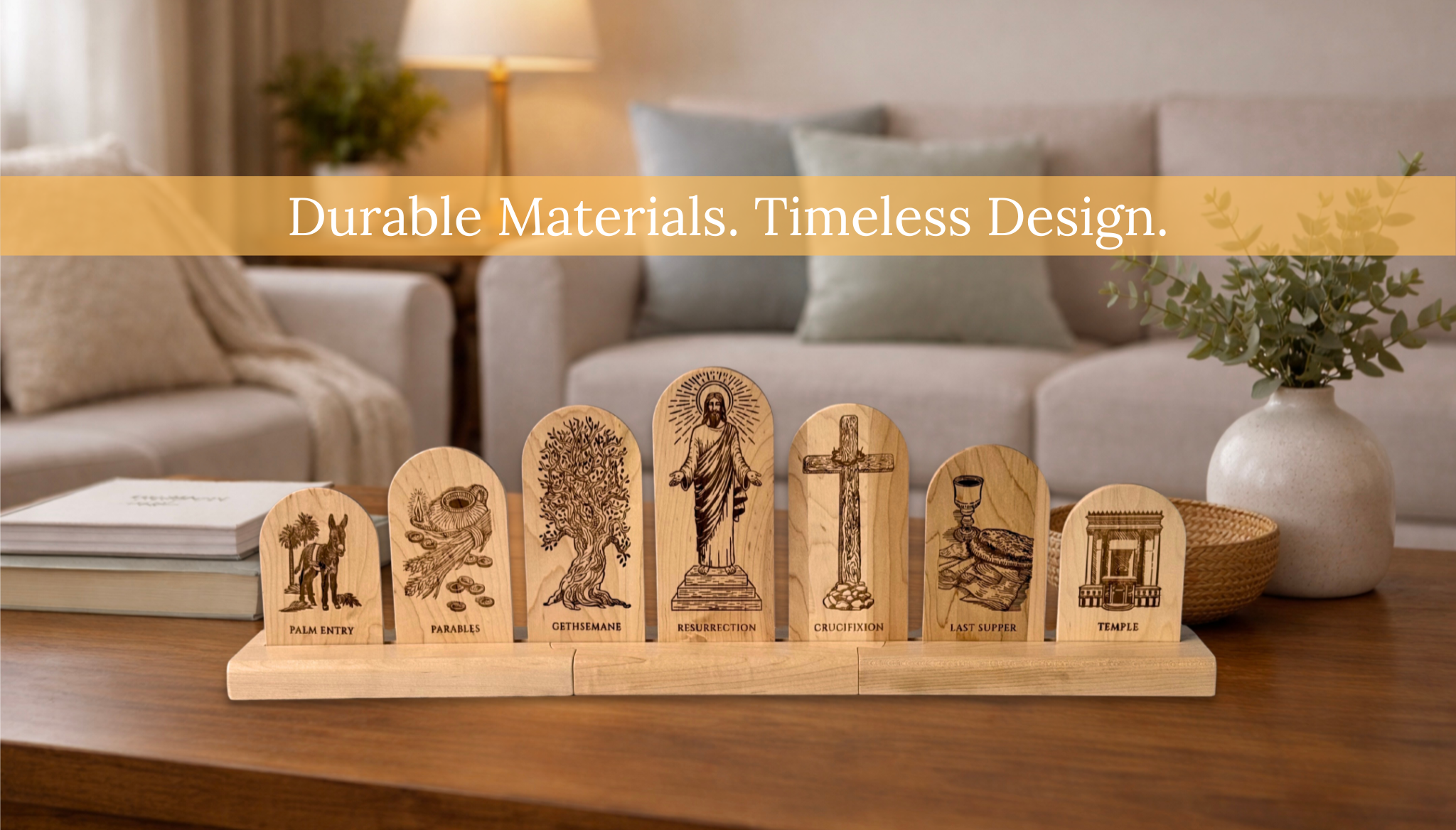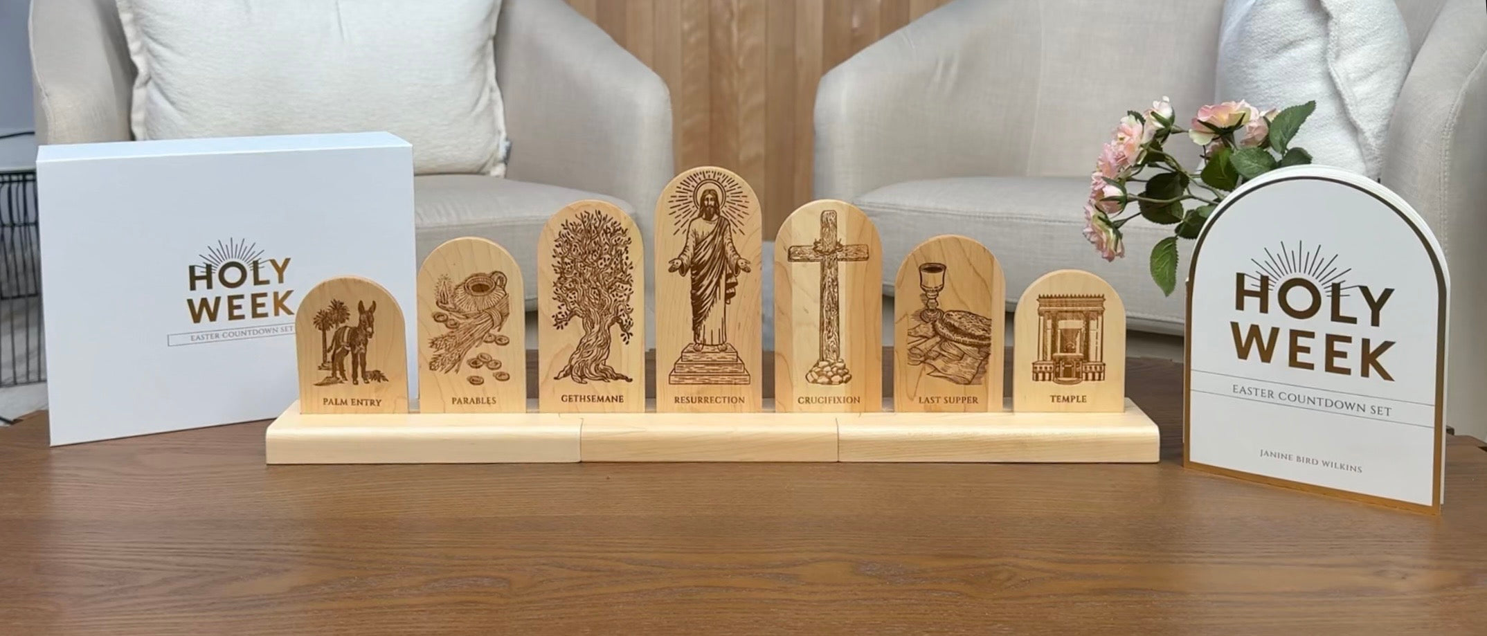 Connect the three pieces of the wooden display track. Beginning on Palm Sunday, invite your children to add the figure for that day, guided by the daily placement diagram in the book. As the week progresses, the Holy Week display will unfold.